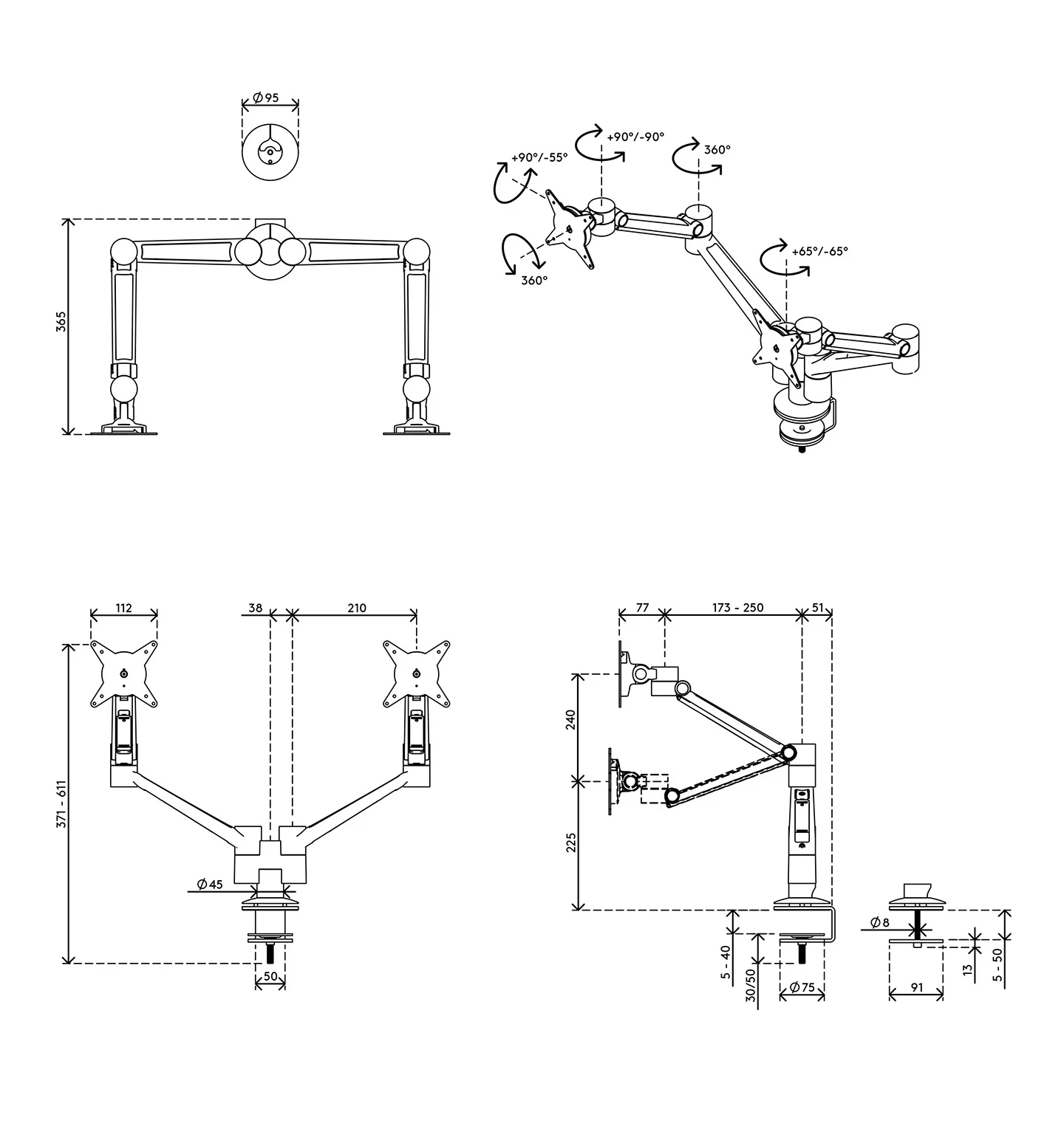 - Monitor: înclinare +90°/-55°, rotire +90°/-90°, rotire 360°