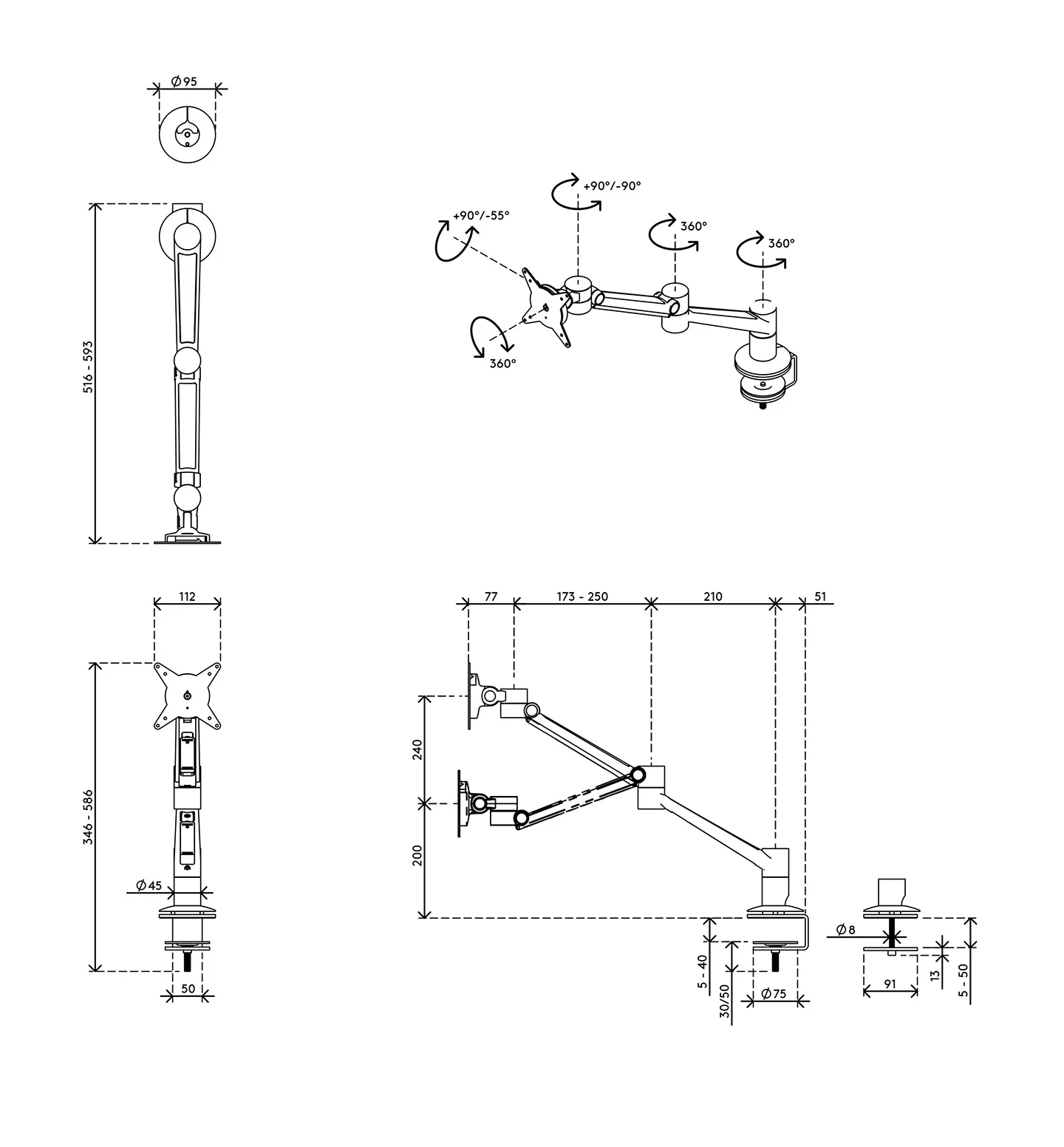 - Potrivit pentru o grosime a blatului de birou de 5 până la 40 mm (0,2„ – 1,6”) (clemă) sau 50 mm (2,0″) (șuruburi)