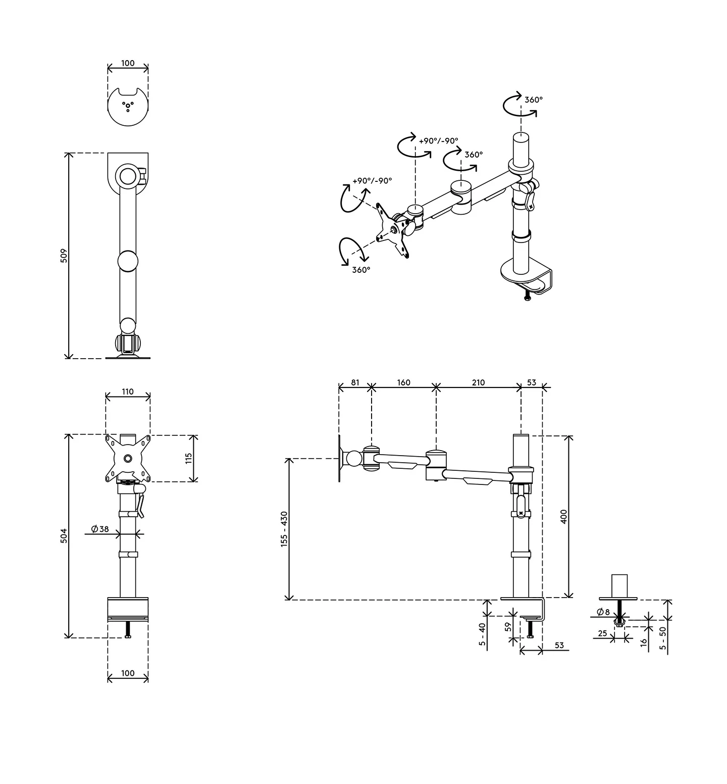 - Monitor: înclinare +90°/-90°, rotire +90°/-90°, rotire 360°