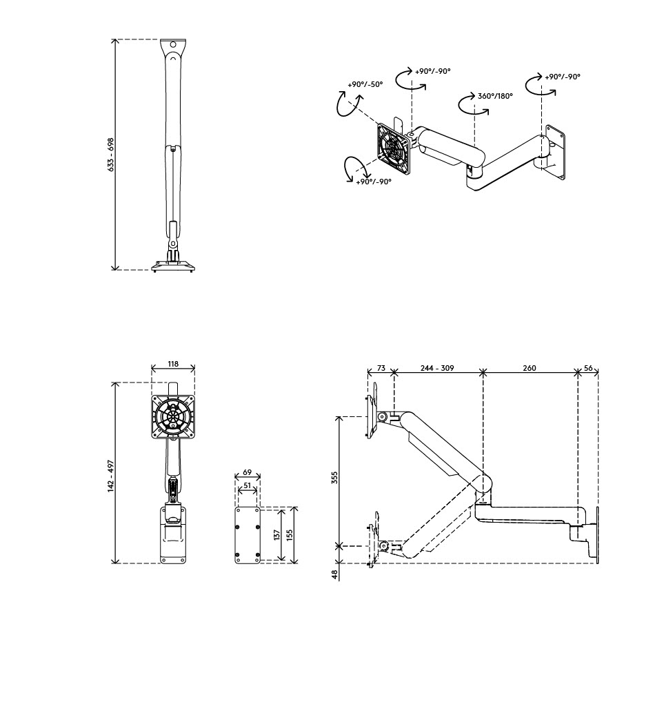 - Monitor: înclinare +90°/-50°, rotire ±90º, rotire ±90º