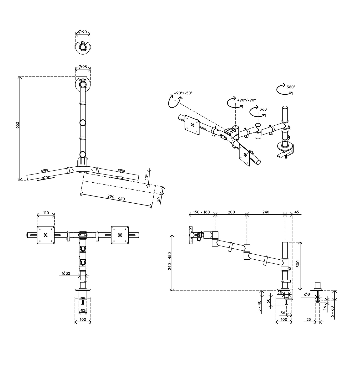- Potrivit pentru grosimi de birou de la 5 pana la 40 mm (0,2″- 1,6″) (clema) sau 60 mm (2,4″) (prin surub)