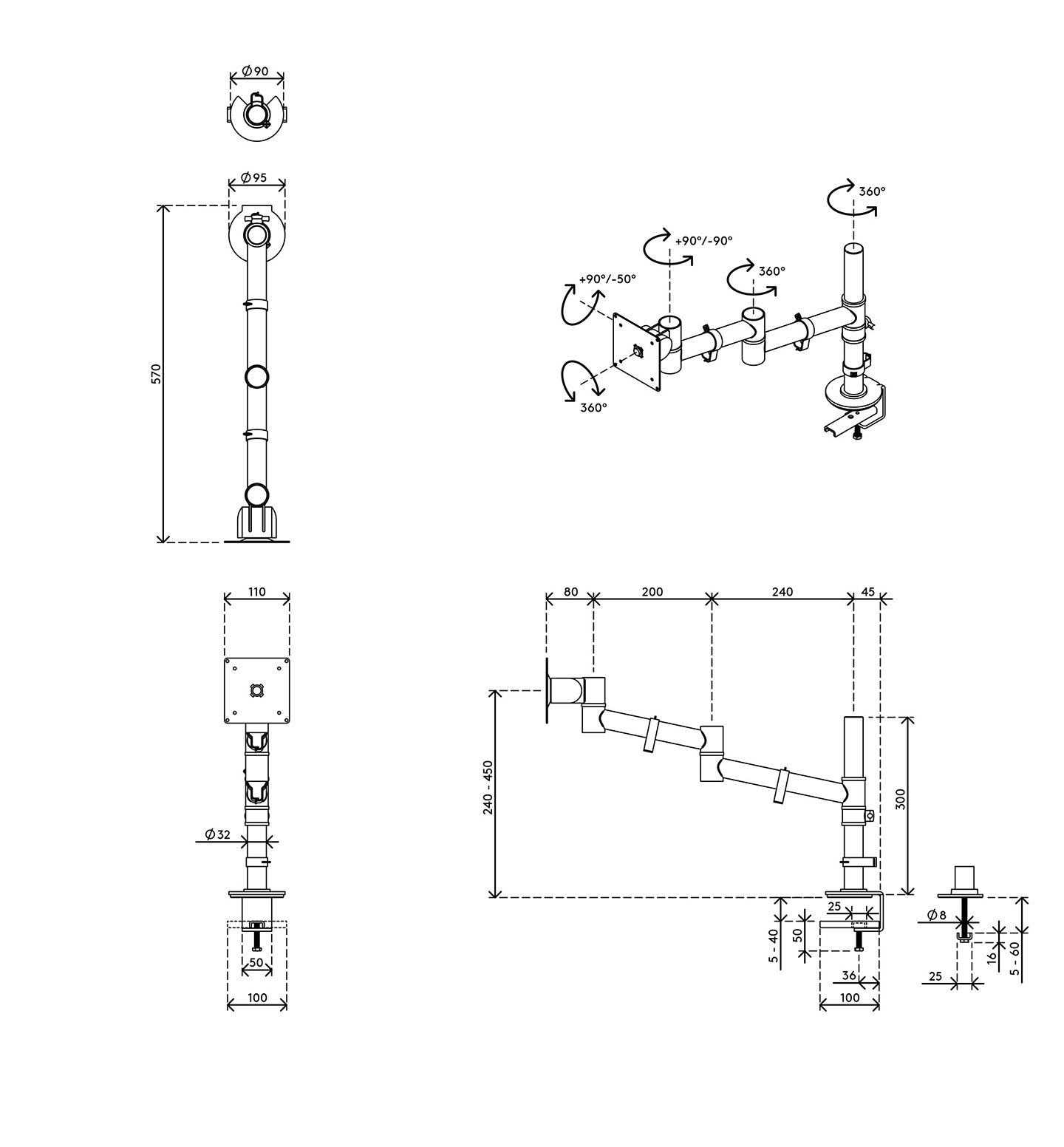 - Potrivit pentru grosimi de birou de la 5 pana la 40 mm (0,2″- 1,6″) (clema) sau 60 mm (2,4″) (prin surub)